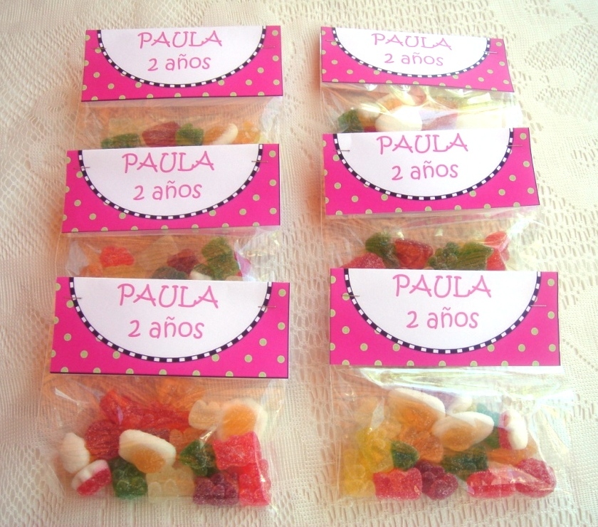Le confeccionamos bolsitas de chuches personalizadas con su nombre y cartelitos para los aperitivos a juego.